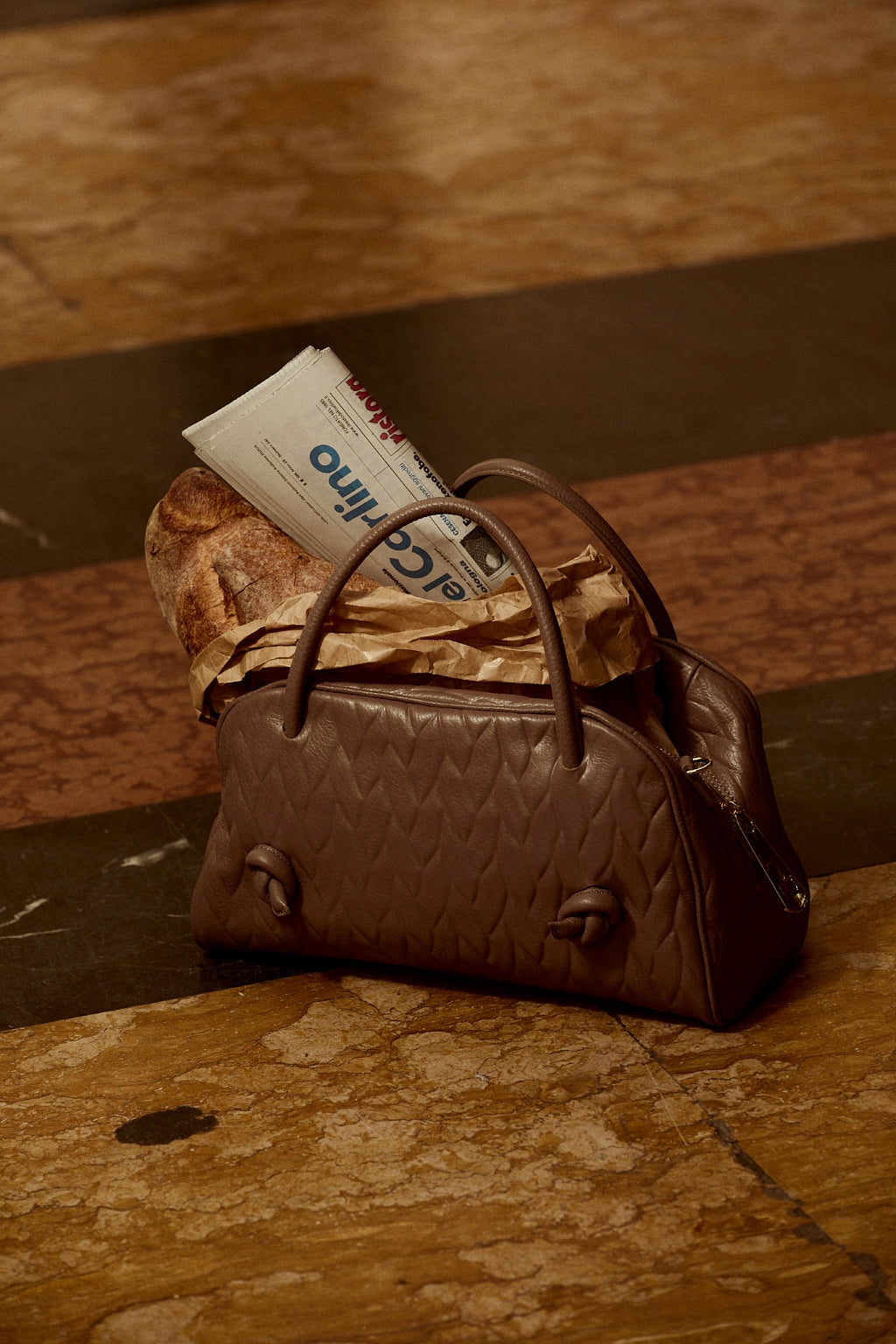 Realizzata in morbida pelle di vitello con una raffinata stampa effetto treccia, si distingue per la silhouette morbida e i due nodi decorativi frontali, che aggiungono un tocco sofisticato e contemporaneo.