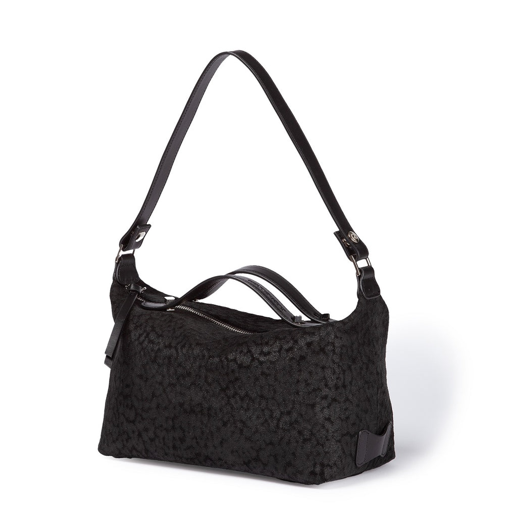 La Giuditta Bowling combina praticità ed eleganza in un design compatto e sofisticato. Realizzata in raffinato pellame scamosciato con stampa animalier e arricchita da dettagli in pelle liscia, aggiunge un tocco di stile ai tuoi look quotidiani.