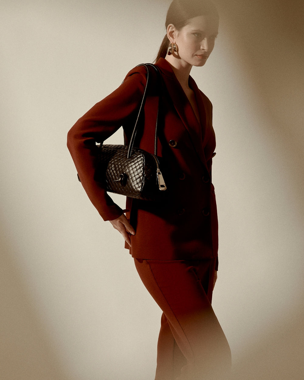 Realizzata in morbida pelle di vitello con una delicata stampa effetto intreccio, esprime un equilibrio perfetto tra stile contemporaneo e dettagli raffinati. I doppi manici lunghi permettono di indossarla comodamente a spalla per un’eleganza minimalista, ma grazie a un semplice secondo nodo sui manici, la tracolla si accorcia e la borsa si trasforma in una pratica ed elegante borsa a mano.