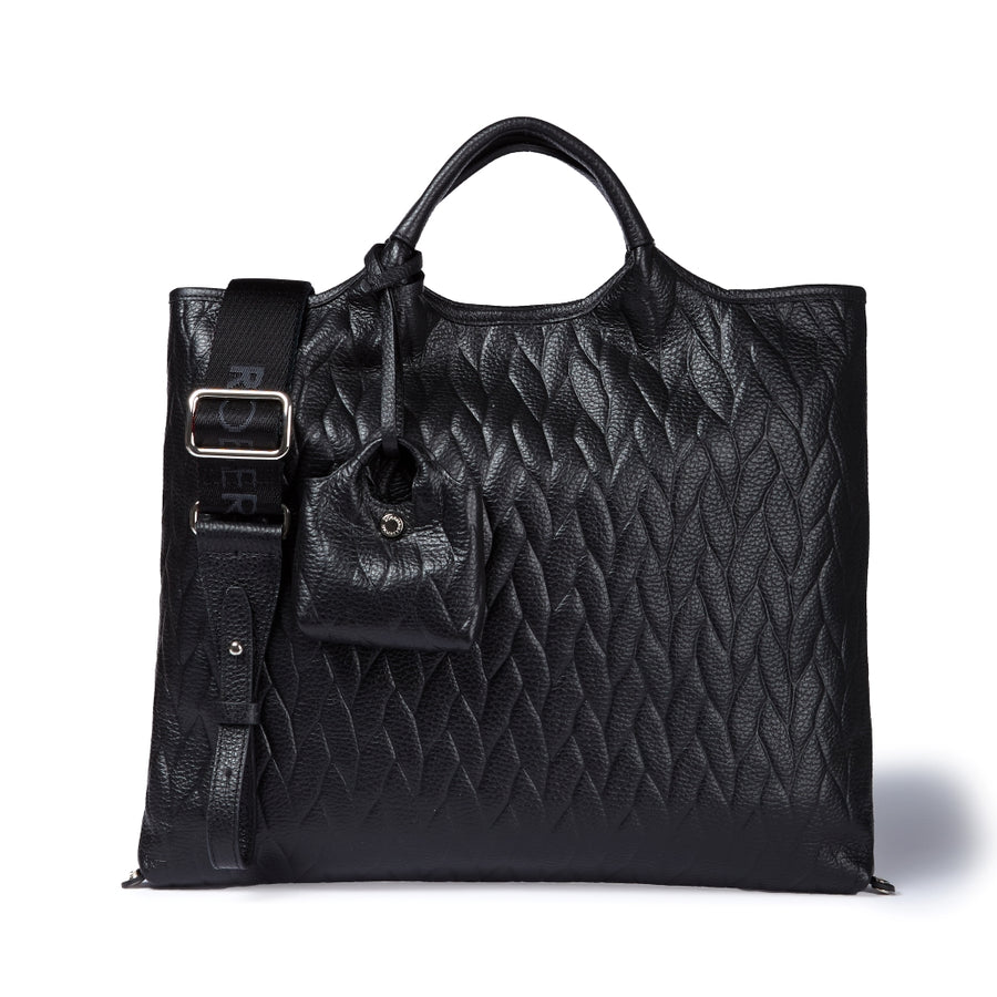 Realizzata in morbida pelle di vitello con stampa effetto treccia, questa borsa si distingue per la texture raffinata e il carattere contemporaneo. Grazie ai bottoni a pressione e ai ganci interni, può essere modellata in cinque forme diverse