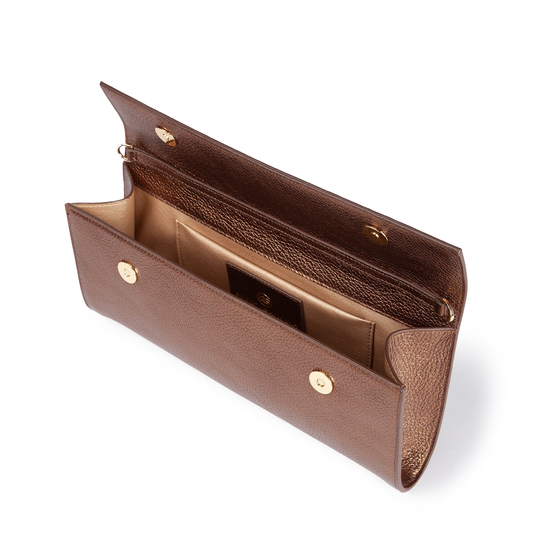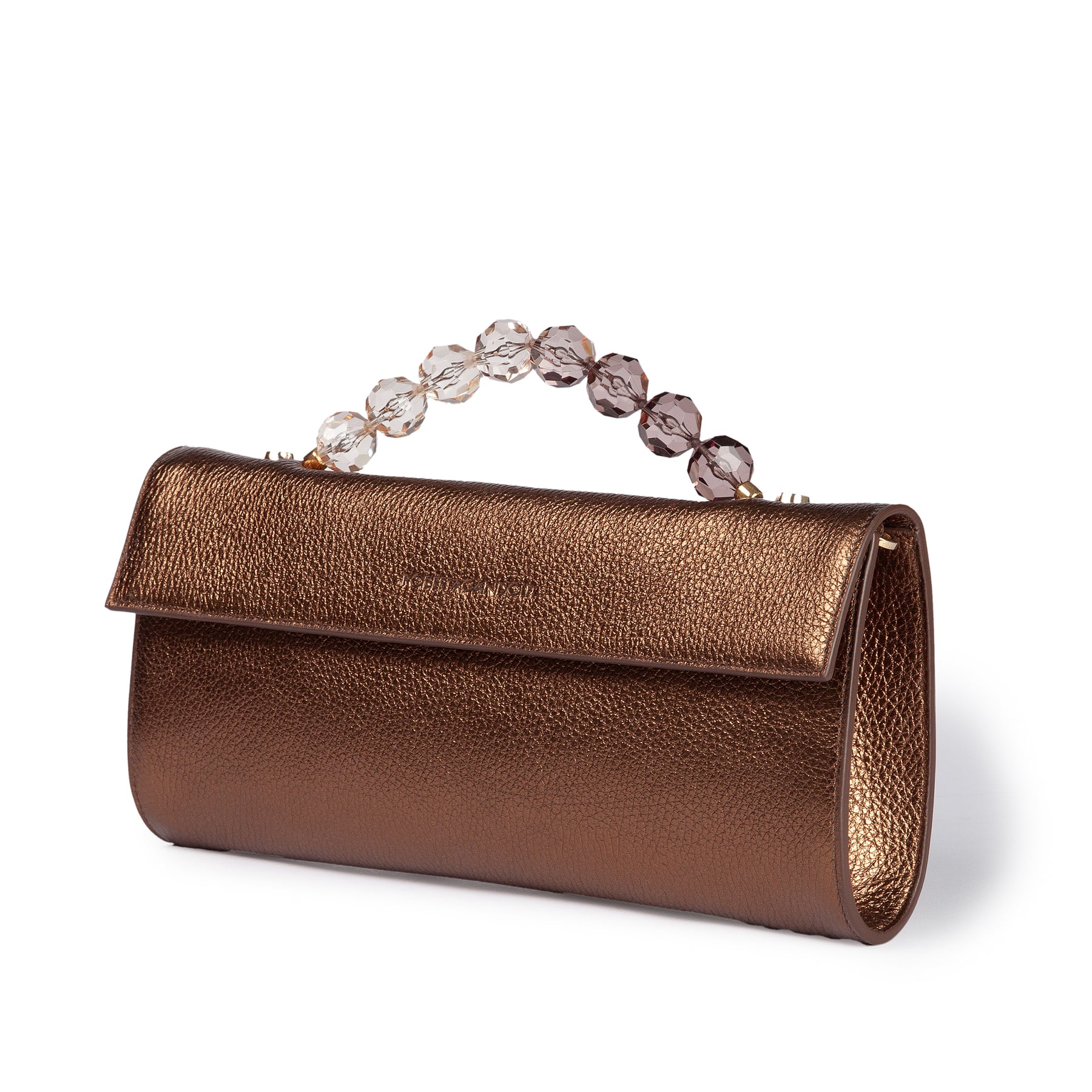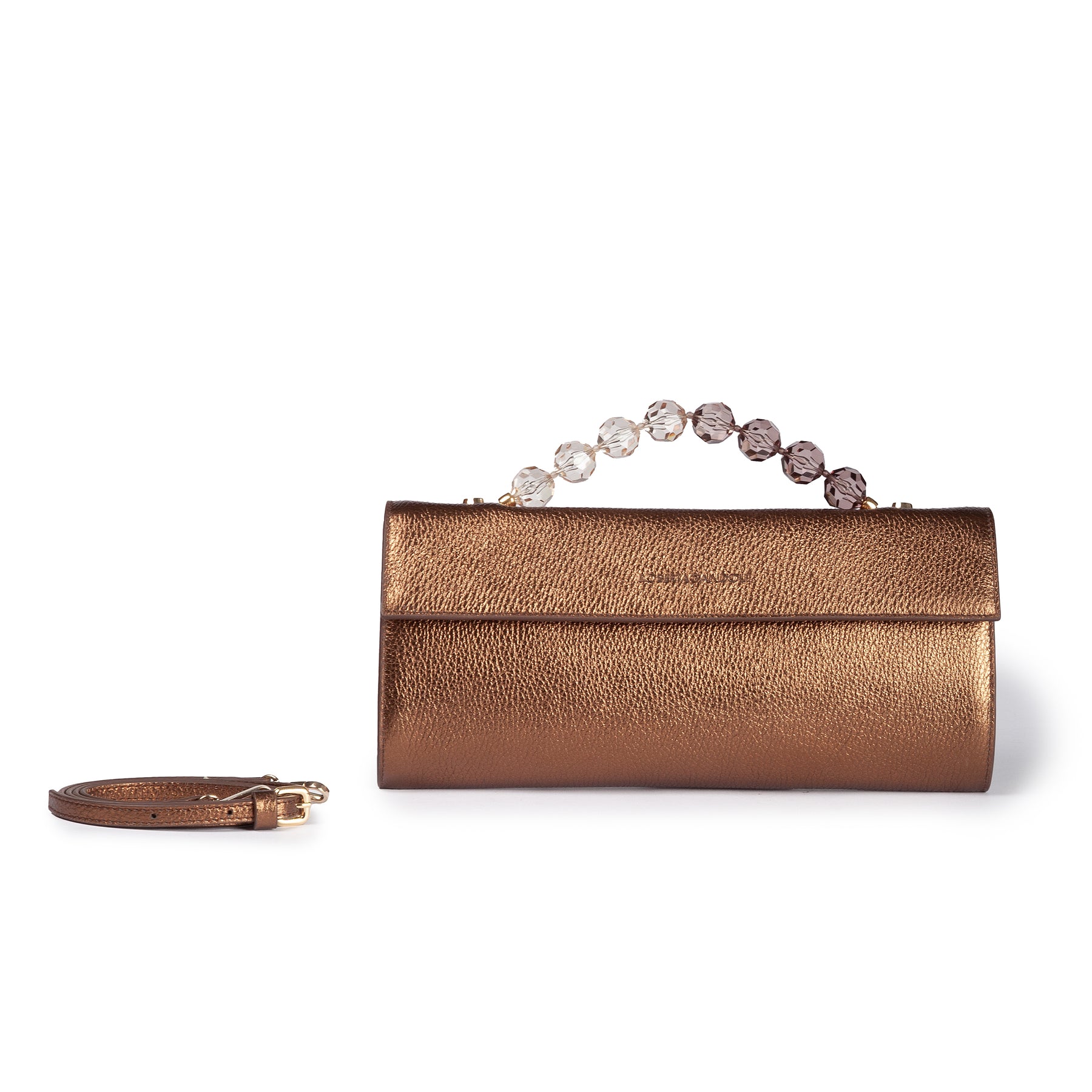 Julia Boule Clutch è progettata per chi desidera un accessorio versatile e sempre alla moda. La pelle martellata metallizzata conferisce alla borsa un aspetto sofisticato, mentre il manico gioiello aggiunge un tocco di lusso. La tracolla staccabile e regolabile in pelle offre diverse opzioni di utilizzo: a mano per un look più formale o a tracolla per un tocco casual.