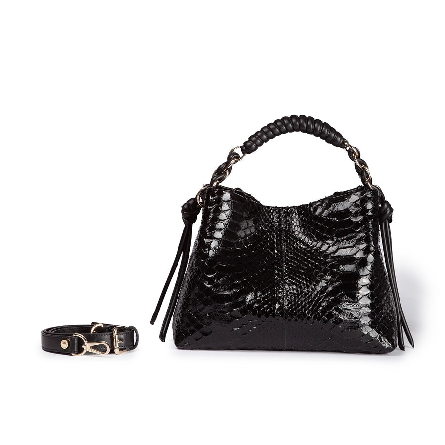 A truly distinctive element of the Amina small python is the soft leather tubing which creates this spectacular grip with intertwining and wrapping effects.