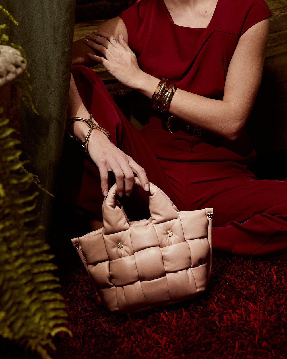 Ironic and decidedly unusual weaves reinterpret the classic nappa in a "bold" key