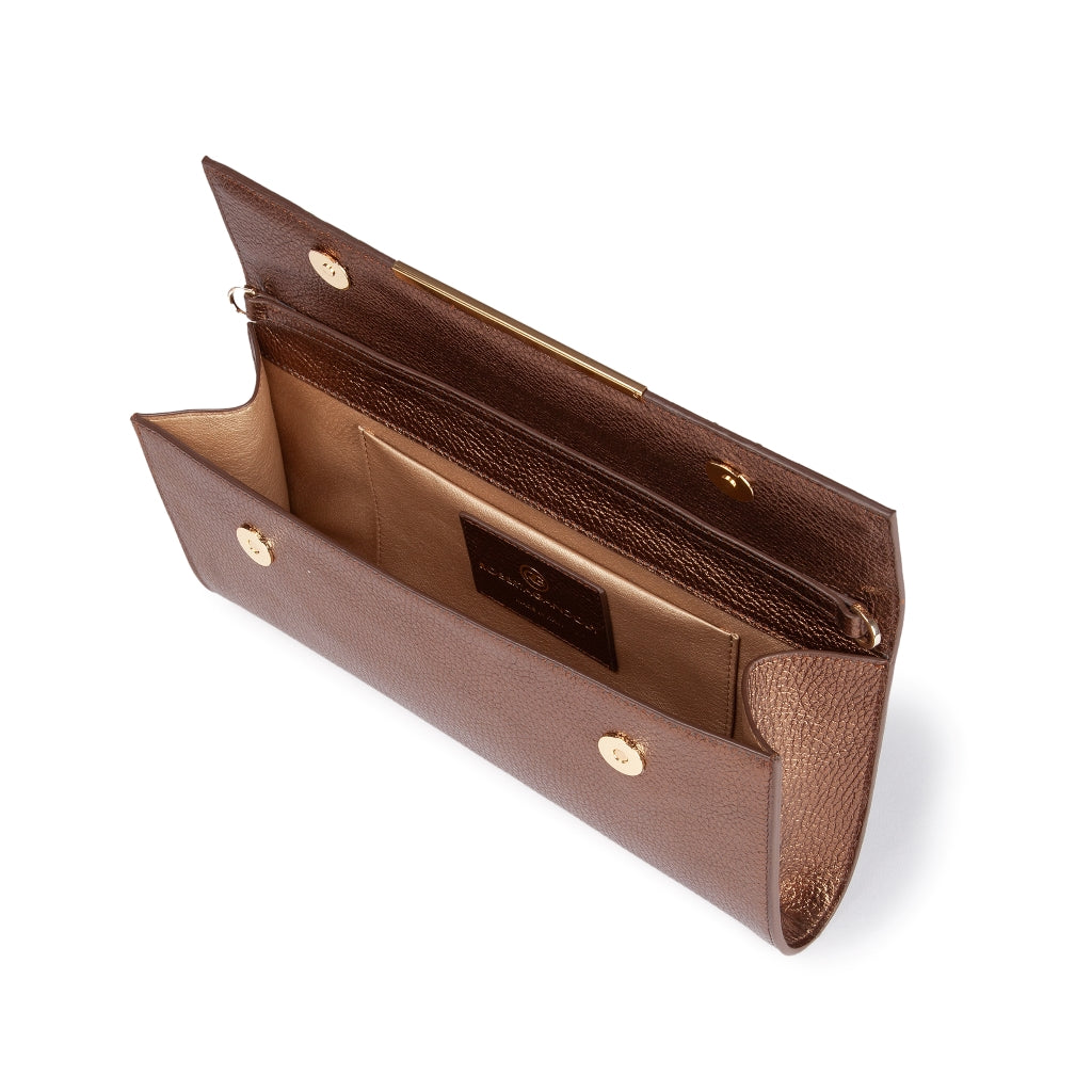 The golden chain shoulder strap allows you to wear the bag on the shoulder