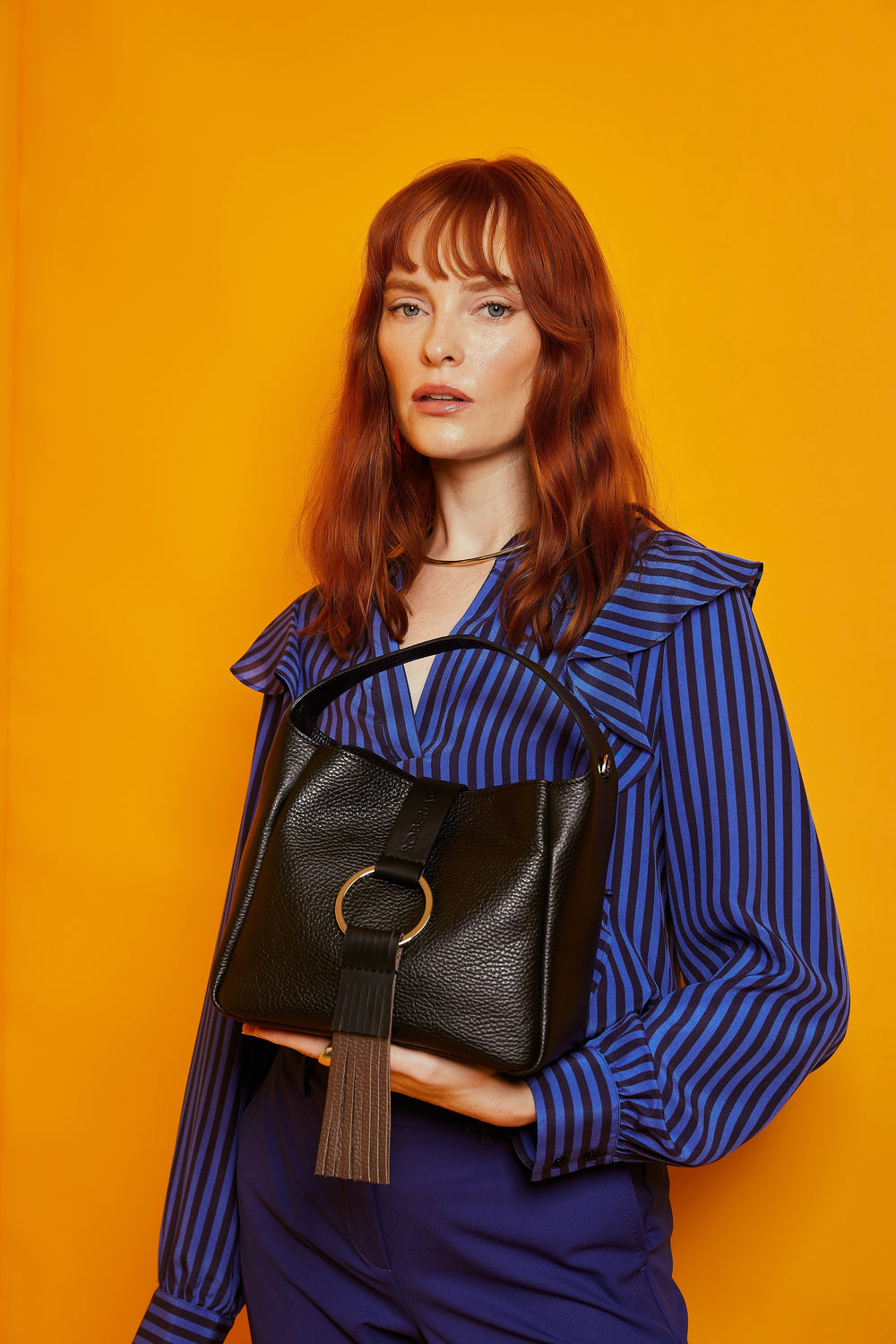 The side wraps the bag ending in the shoulder strap that emphasizes the rounded and harmonious line