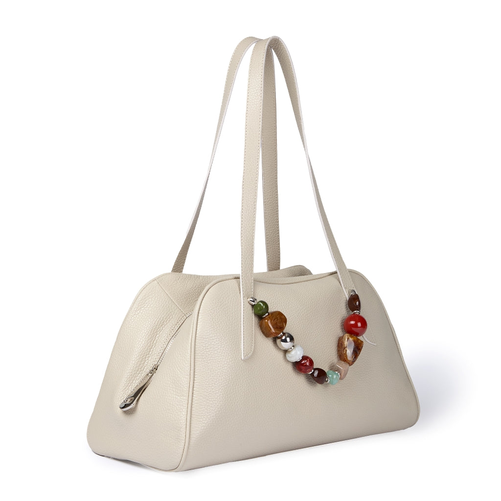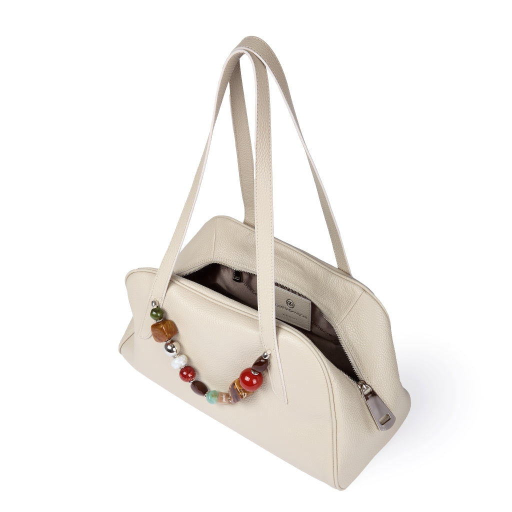 Realizzata in pelle di alta qualità, si distingue per le sue linee arrotondate e armoniose che definiscono una silhouette elegante ma versatile. Il manico gioiello, elemento distintivo della borsa, illumina il design con un accento prezioso, mentre le maniglie lunghe permettono di indossarla comodamente a spalla, adattandosi con naturalezza alla vita quotidiana.